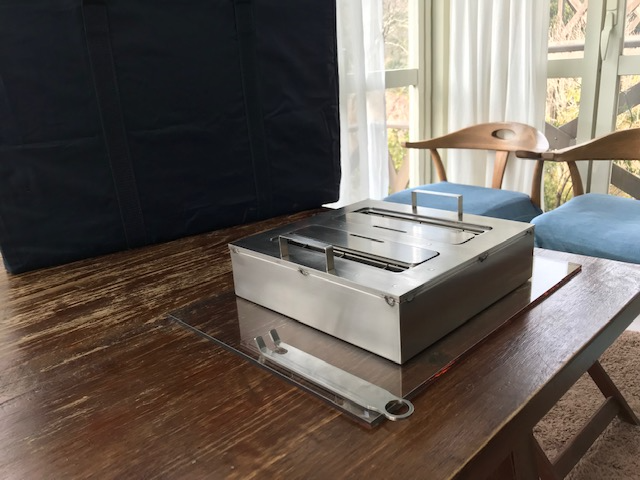 外装材料は鋳物、燃焼室は内部に格納しています。その燃料はエタノール(原料:大豆・とうもろこし)です。外装本体の温度は約90度で蓄熱されています。中央のステンレス製の丸いフタを取り外してヤカンでお湯が沸きます。イメージはコーヒーのサイファンです。また、蓄熱温度の二次利用で、この円形部分にお好みでアロマオイルを数滴垂らすとアロマテラピーの効用をもたらします。